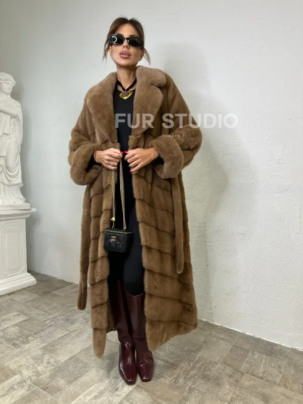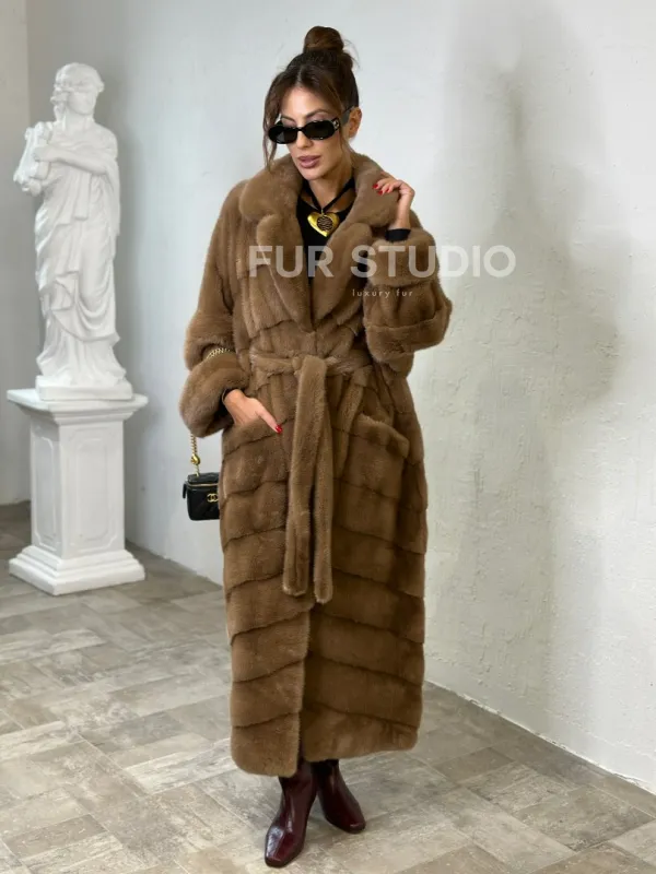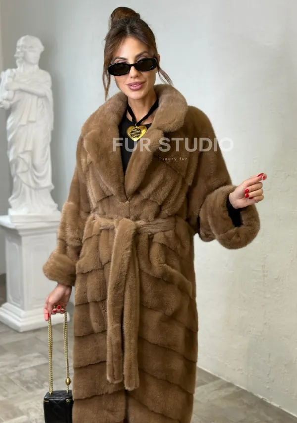 Мех данной шубы аукционная норка , цвет бежевый. Предлагается в размерах от 40 до 50. Длина модели 125-130 см, что выгодно подчеркивает фигуру девушек. Эта модель идеально подойдет для девушек и женщин, предпочитающих роскошные натуральные меха.