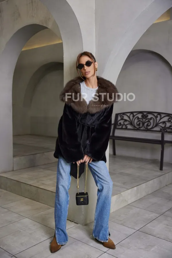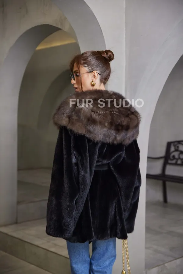 норка в роспуск шуба - черная с капюшоном куница 100779