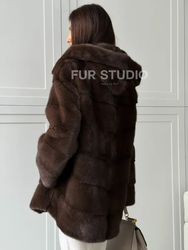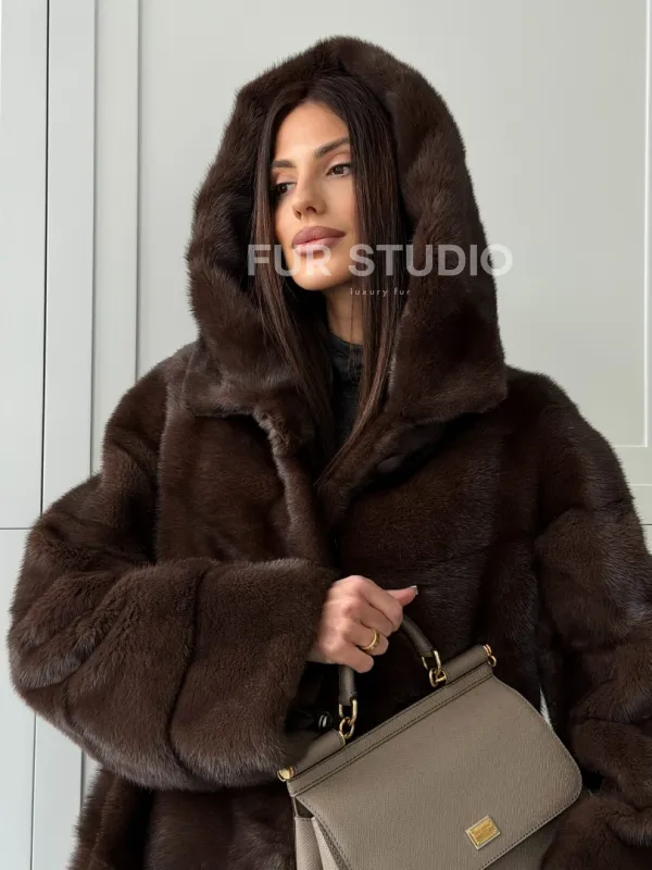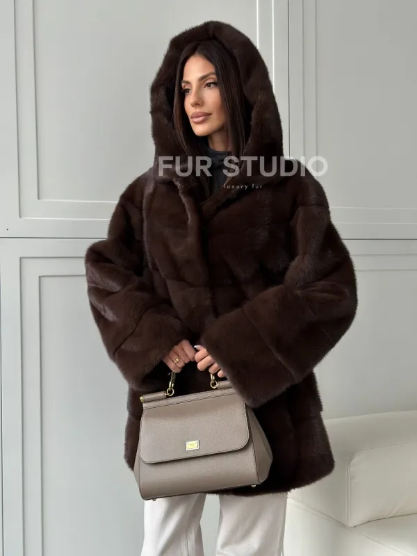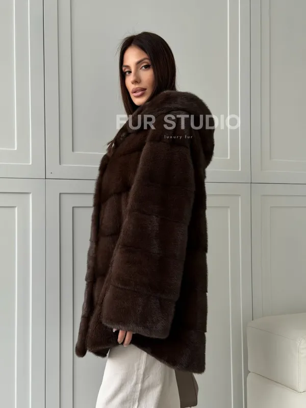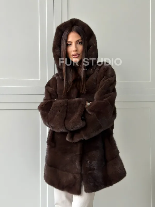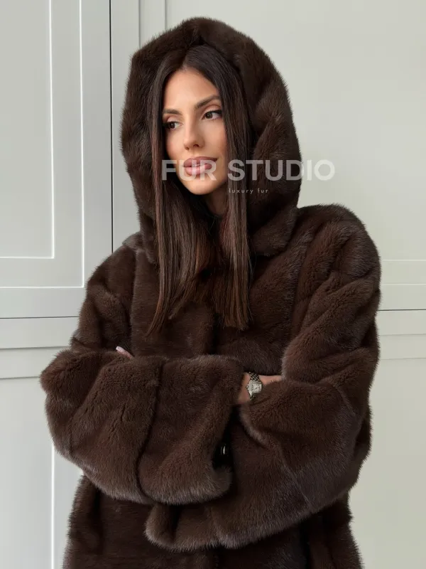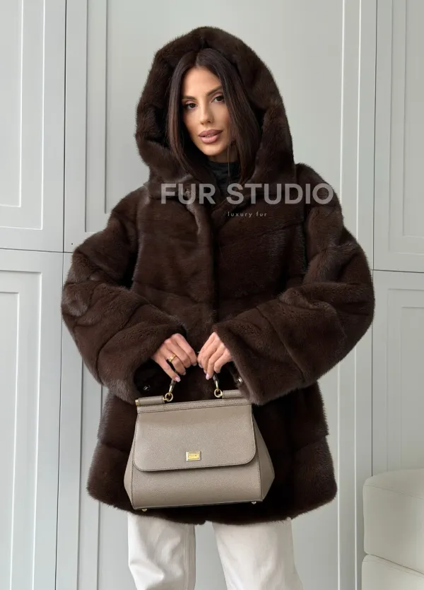 Норковая шуба в стиле «рубашка» с капюшоном 102826
