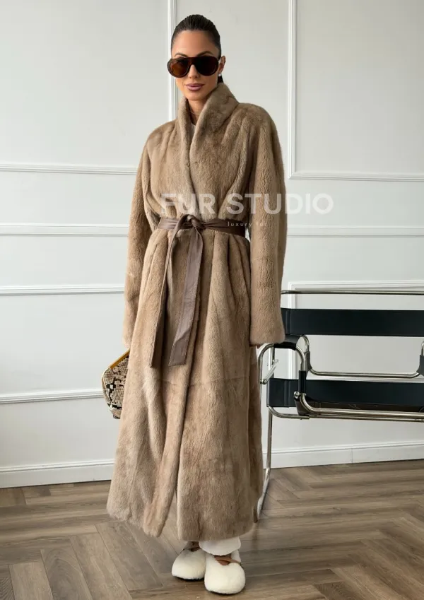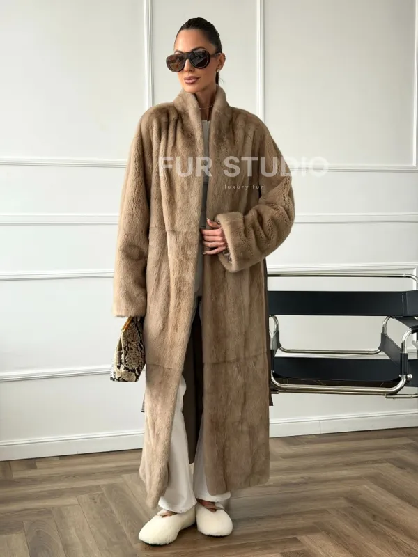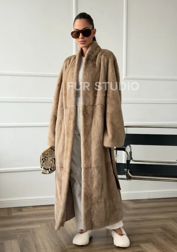 Мех данной шубы аукционная норка, цвет бежевый. Предлагается в размерах от 42 до 48. Длина модели 120-125 см , что выгодно подчеркивает фигуру девушек. Эта модель идеально подойдет для девушек и женщин, предпочитающих роскошные натуральные меха.
