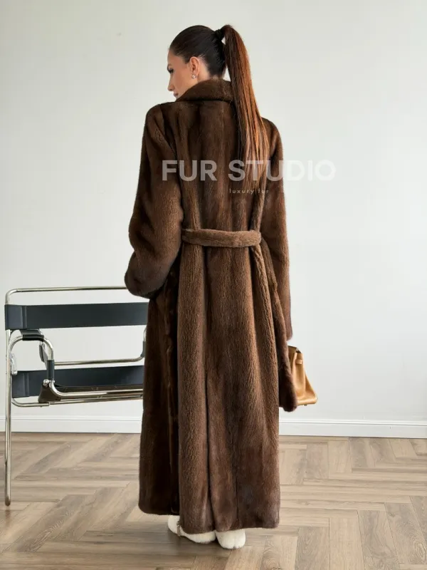 Прямая шуба из норки с поясом 102645