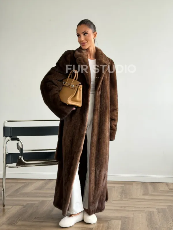 Мех данной шубы аукционная норка , цвет коричневый. Предлагается в размерах от 42 до 48. Длина модели 125-130 см, что выгодно подчеркивает фигуру девушек. Эта модель идеально подойдет для девушек и женщин, предпочитающих роскошные натуральные меха.