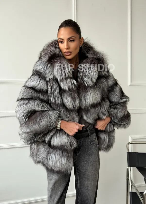 Мех данной шубы лиса, цвет серый. Предлагается в размерах от 42 до 48. Длина модели 60-65 см, что выгодно подчеркивает фигуру девушек. Эта модель идеально подойдет для девушек и женщин, предпочитающих роскошные натуральные меха.