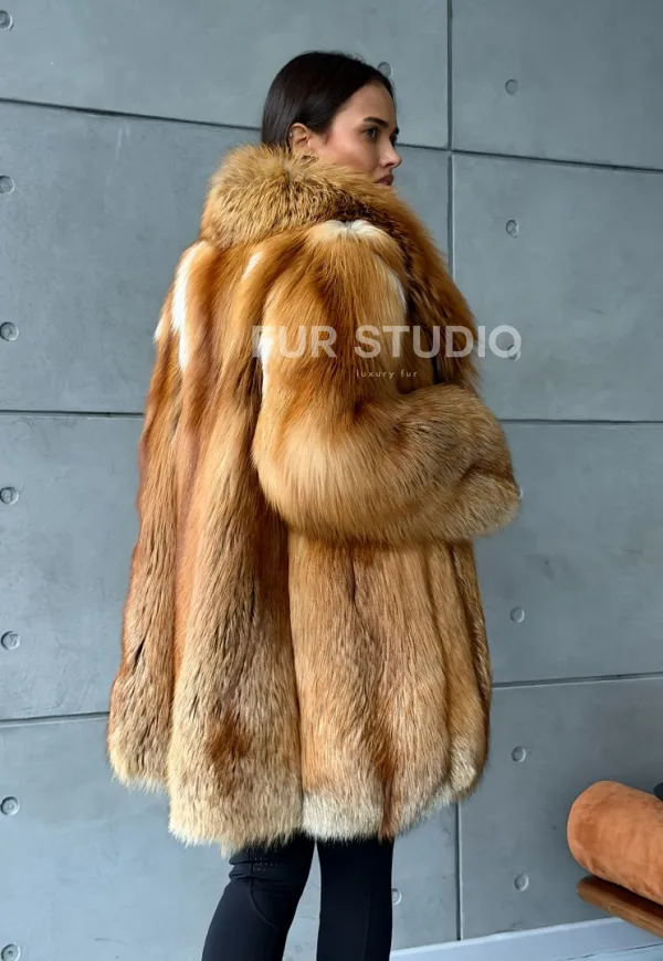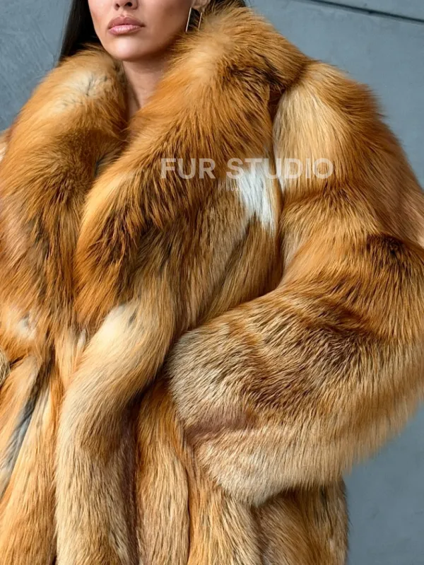 Мех данной шубы лиса, цвет рыжий. Предлагается в размерах от 40 до 52. Длина модели 80-85 см, что выгодно подчеркивает фигуру девушек. Эта модель идеально подойдет для девушек и женщин, предпочитающих роскошные натуральные меха.